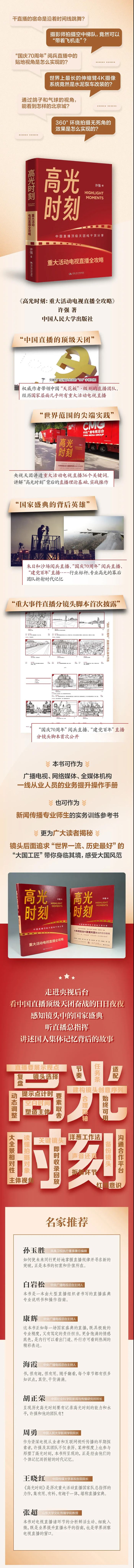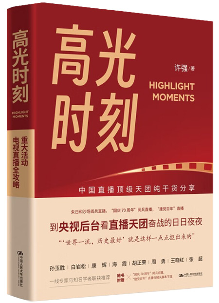 各位读者正在阅读的这本《高光时刻——重大活动电视直播全攻略》是一本有关电视新闻直播的,有用、有趣、有料的全新著作。作者许强毕业于中国传媒大学前身北京广播学院的电视系,30多年奋战在中国最主要的电视媒体——中央电视台的电视新闻报道一线,亲身经历了影响中国和世界的众多新闻事件,并通过他和团队的电视传播实践,用影像收录、记载下来这些重大时刻、重要事件和关键场景,通过直播、录播或转播的形式,借助电视以及众多其他平台传播到全中国、全世界,用视听影像,特别是电视新闻直播话语体系彰显了时代意义,创造了历史价值。