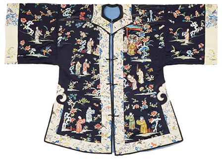 下图是一件清代汉族女性的外褂。款式为圆领、对襟,左右开衩。女褂以黑色素缎为绣底,通过平绣、打粒子绣、盘金绣等技法,栩栩如生地绣出郭子仪庆寿的隆重场景。