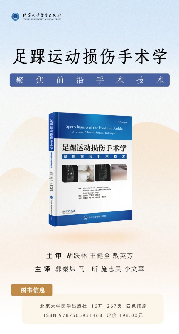 意大利的Gian Luigi Canata教授、卡塔尔的Pieter d' Hooghe教授、美国的Kenneth J. Hunt 教授、荷兰的 Gino M. M. J. Kerkhoffs 教授和意大利的 Umile Giuseppe Longo 教授担任本书的主编,组织 ISAKOS 的众多专家精心编写了这本专著。此书聚焦于足踝运动损伤的前沿外科手术方法与技巧,包括关节镜下韧带修复与重建、软骨修复与移植,以及肌腱缝合与止点重建等。同时,本书在影像学诊断、术前规划以及术后科学康复等方面进行了详细阐述,并对高水平运动员伤病的诊治以及软骨修复领域的新进展,例如各种生物活性材料和软骨组织工程的相关问题展开了深入讨论。