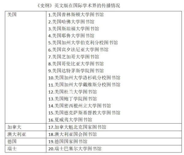 学术著作在世界图书馆的馆藏情况是衡量其学术水平和国际影响力的重要指标,走进海外高等学府和国家图书馆也是推动中国学术走出去的重要途径。根据英文版出版方提供的统计数据分析,目前《史纲》英文版被美国、加拿大、澳大利亚、德国、瑞士20余家图书馆所馆藏,成功走进世界一流大学和多国国家图书馆。其中包括美国普林斯顿大学、哈佛大学、斯坦福大学、耶鲁大学、加州大学伯克利分校、宾夕法尼亚大学、芝加哥大学、哥伦比亚大学、达特茅斯学院、加州大学洛杉矶分校,瑞士巴塞尔大学等17家大学图书馆;澳大利亚国会图书馆、德国国家图书馆、加拿大魁北克国家图书馆等3家国家图书馆。中国香港中文大学图书馆、香港科技大学图书馆亦收藏了该书。