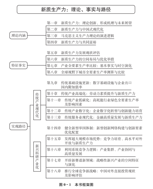 第一篇包括四章。第一章从发展中国特色政治经济学、推动高质量发展和构建人类命运共同体等方面阐述了新质生产力的理论先进性,接着从 “技术创新—先导产业—核心要素—基础设施—组织方式”等方面阐释新质生产力的形成机理和重点发展领域,最后点明新质生产力发展存在的挑战和切实可行的政策措施。