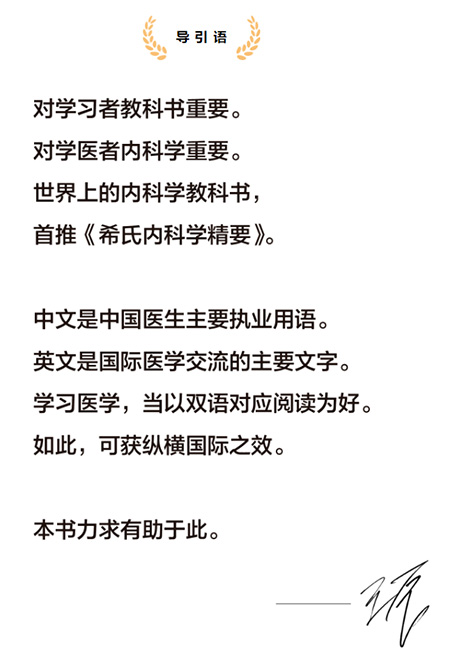 让我国医学生与国际医学生站在同一起跑线上的首要之事,是为其提供具有世界先进水平的标准教材。我们应争取使每一位医学生都能接触到内容经典、充分代表现代医学水平的国际权威原文教材并力求准确翻译,提供原文与中文双语对照版本,使医学生和医生在学习中形成双语医学词语、概念、概念间逻辑及由此构成的医学知识体系。在这样的思想驱动下,国际经典内科学教科书《希氏内科学精要(第10版)》中英双语版应运而生。