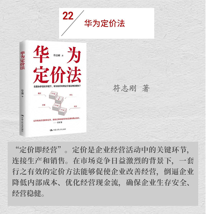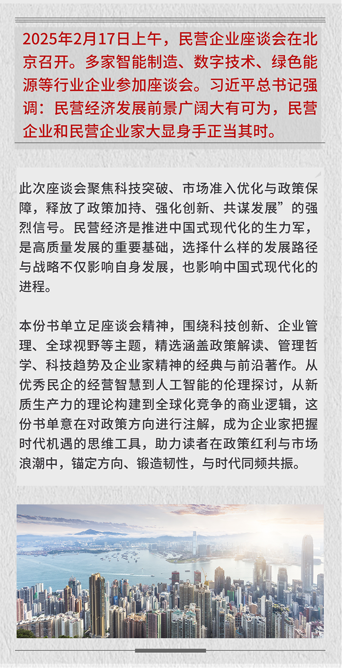中国人民大学出版社推荐有关民营企业座谈会书单,包括24本图书:《新质生产力:理论、事实与路径》《新质生产力的政治经济学》《科技创新与新质生产力》《中国新经济:创新与规则》《潮起:中国创新型企业的诞生》《大变局下的中国管理2:专精特新之路》《赢在组织》《终局思维》《新出海:中企海外本土化实战手册》《全球竞争力培育》《组队》《企业家精神——商业与社会变革的核能》《社会企业家精神》《社会企业家精神(第二辑)》《创业中国故事》《弄潮:中国民营企业的成长与社会责任》《失衡与重塑——百年变局下的中国与世界经济》《中国道路的政治经济学》《华为规模营销法》《华为三十年——从中国出发的全球化》《华为战略管理法》《华为定价法》《数字经济与数字化转型》《零售供应链数字化创新》。