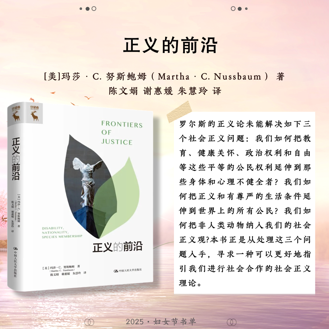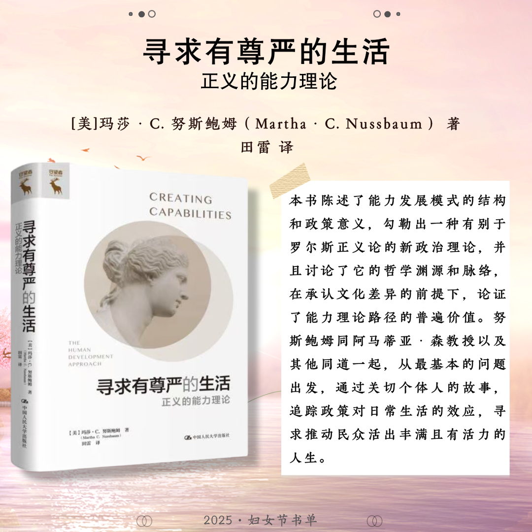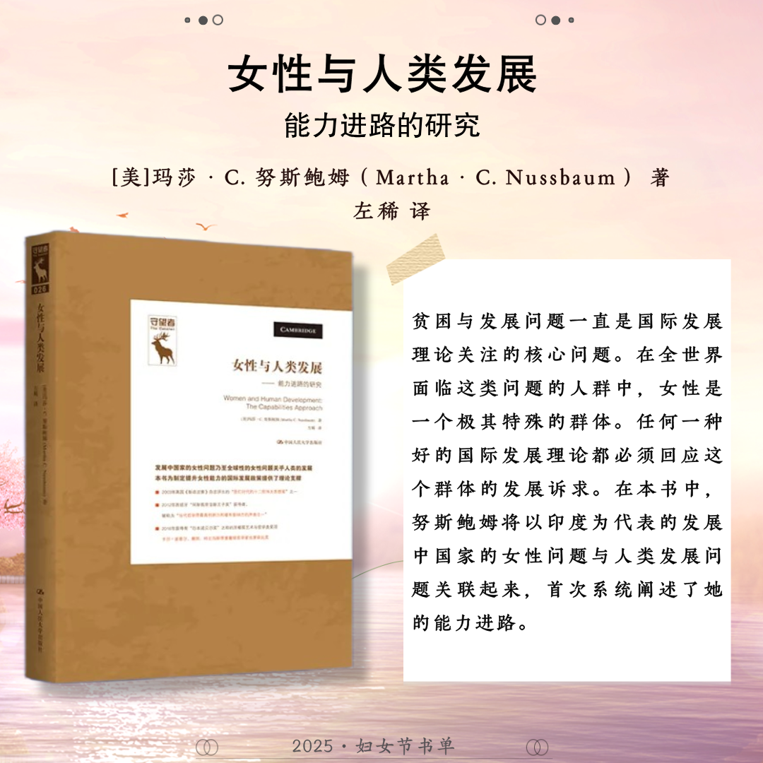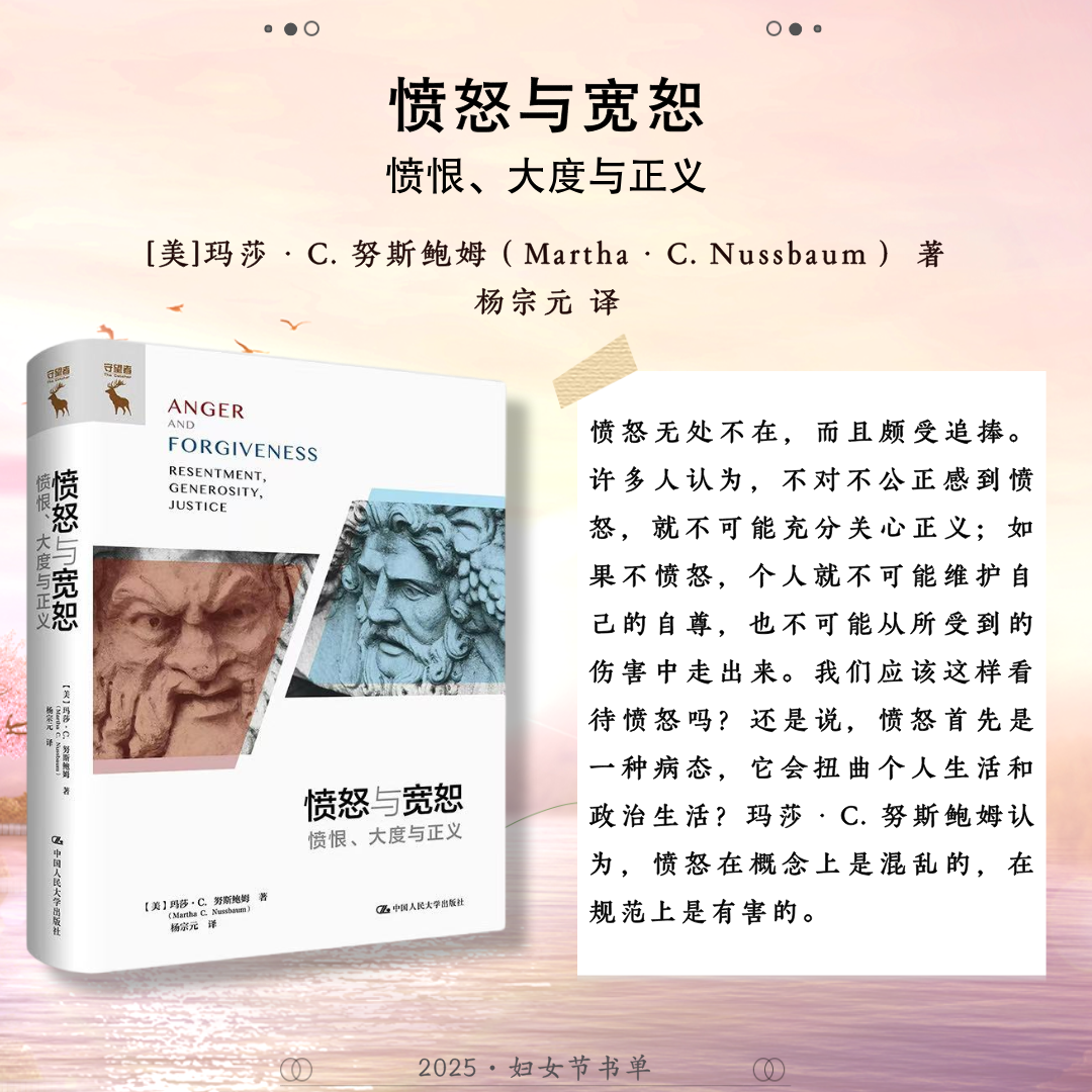 世界辽阔,她自成风景。中国人民大学出版社推荐24本关于女性的著作,包括:《妇女教育》《马克思主义与女性主义》《女性与人类发展——能力进路的研究》《正义的前沿》《寻求有尊严的生活:正义的能力理论》《政治情感:爱对于正义为何重要?》《愤怒与宽恕:愤恨、大度与正义》《男性统治》《玫瑰与利剑:改变历史的非凡女性》《我们的女王:伊丽莎白二世》《妮萨:一名昆族女子的生活与心声》《重访妮萨》《壶政:清代宫廷女性研究》《爱的能量:爱情哲学50讲》《爱与意志:罗洛·梅文集)》《爱情关系》《伯克毕生发展心理学(第7版)》《婚姻家庭社会学》《传承与变迁:当代中国家庭结构与家庭养老》《努力的意义:积极的自我理论》《自愈》《心力》《她职场:活出女性光芒》《做一个灵魂有香气的女教师》,希望这些书能助力每位女性照见属于自己的力量与光芒。