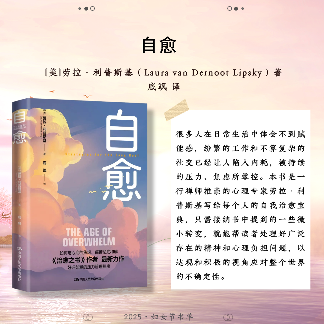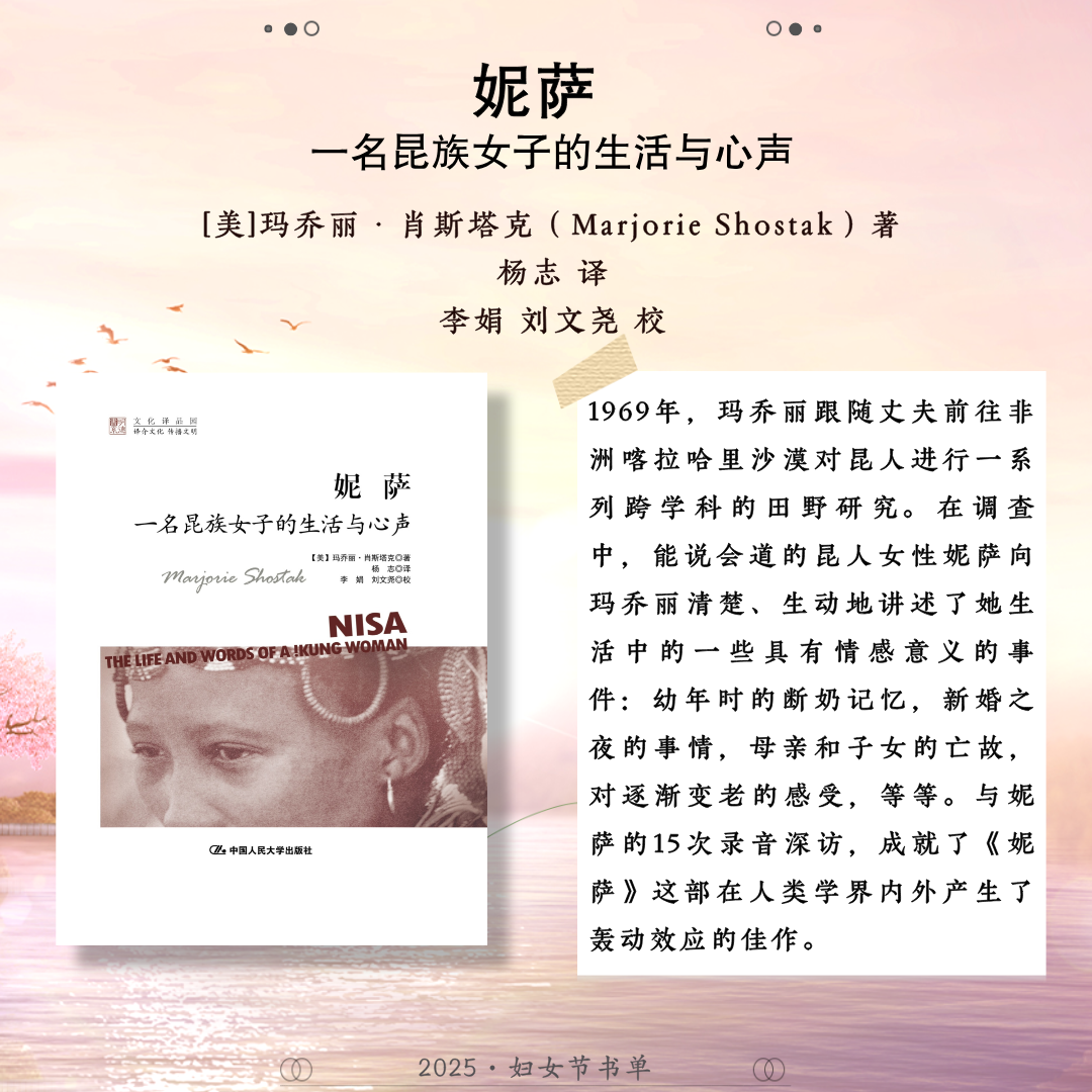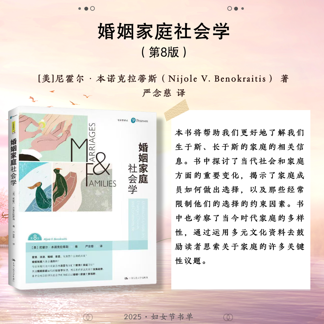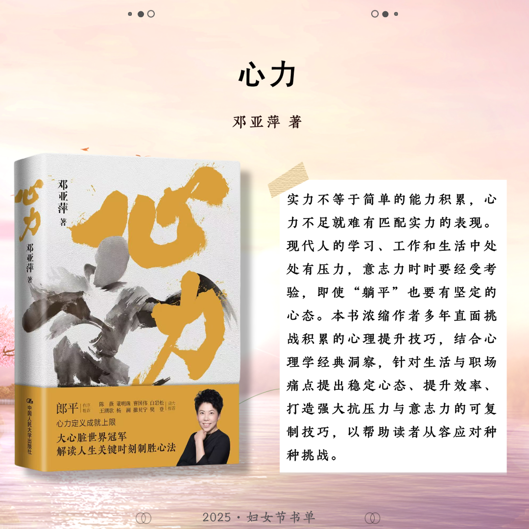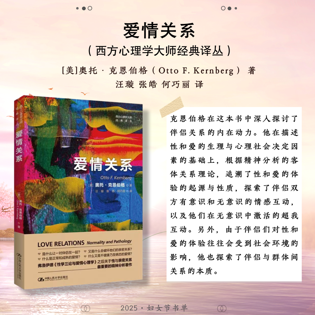 世界辽阔,她自成风景。中国人民大学出版社推荐24本关于女性的著作,包括:《妇女教育》《马克思主义与女性主义》《女性与人类发展——能力进路的研究》《正义的前沿》《寻求有尊严的生活:正义的能力理论》《政治情感:爱对于正义为何重要?》《愤怒与宽恕:愤恨、大度与正义》《男性统治》《玫瑰与利剑:改变历史的非凡女性》《我们的女王:伊丽莎白二世》《妮萨:一名昆族女子的生活与心声》《重访妮萨》《壶政:清代宫廷女性研究》《爱的能量:爱情哲学50讲》《爱与意志:罗洛·梅文集)》《爱情关系》《伯克毕生发展心理学(第7版)》《婚姻家庭社会学》《传承与变迁:当代中国家庭结构与家庭养老》《努力的意义:积极的自我理论》《自愈》《心力》《她职场:活出女性光芒》《做一个灵魂有香气的女教师》,希望这些书能助力每位女性照见属于自己的力量与光芒。