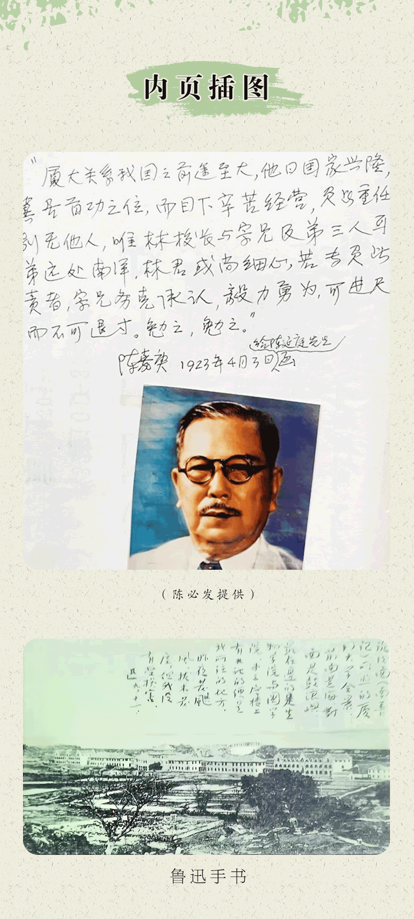 嘉庚先生当年创办厦门大学,对校园建筑一直有自己的构想,也一直在寻找一位能领会并完全贯彻自己理念的践行者。1921年,33岁的同安人陈延庭被聘为校总务主任。嘉庚先生与陈延庭早就有交集,他于1919年在集美陈氏祠堂发表创办厦门大学的著名演讲时,就是陈延庭在现场担任普通话翻译。陈延庭上任后不久,嘉庚先生要他专门担任建筑部主任,主持厦大校园第一期(群贤楼群)的建设工作。陈延庭对嘉庚先生建筑理念高度认同并默契配合,深得嘉庚先生的信任。群贤楼群建设基本告一段落后,嘉庚先生便返回南洋,厦大的所有建筑事宜,都由陈延庭负责,并只接受嘉庚先生的指示,学校其他行政部门不得插手。在接下来的校园建设中,如化学楼、生物楼、博学楼、兼爱楼等(后多数被日军炸毁),遇到校园扩大土地的申请、迁坟补偿等非常棘手问题,陈延庭要到省、区那里求爷爷告奶奶;而坟主们为了多得赔偿,他们不敢告陈嘉庚,也不敢找林文庆,就是缠着陈延庭。可想而知,这是多么艰难的“苦差事”,但陈延庭出色地完成使命(透露一下,陈延庭是厦大蔡启瑞院士的岳父)。嘉庚先生还亲自选了两位在闽南地区经验丰富的“土师傅”,一位是泥水匠林论司,一位木匠郑布司(闽南话“司”为师傅之意)。两位师傅并没有专门上过土木专科学校,也不懂设计绘图,但他们却善于领会嘉庚先生的意图,因为嘉庚建筑的源头就是闽南大厝。此后,以陈延庭为代表的闽南“土师傅团队”,联手绘出壮美的“嘉庚建筑”,一直到新中国成立后50年代的厦大建筑,都是他们的杰作。嘉庚先生曾亲笔致信陈延庭,深情地写道:“厦大关系我国之前途至大,负此重任,别无他人,唯林校长与宗兄及弟三人耳!”“以此三人为代表的开拓者永远存在于厦大建筑背后,贯穿于厦大建筑之中。”