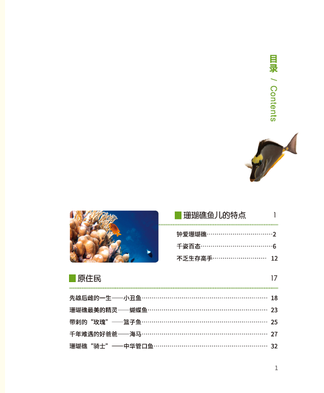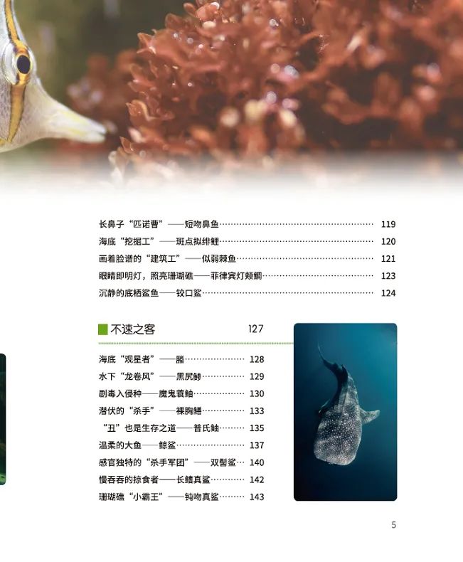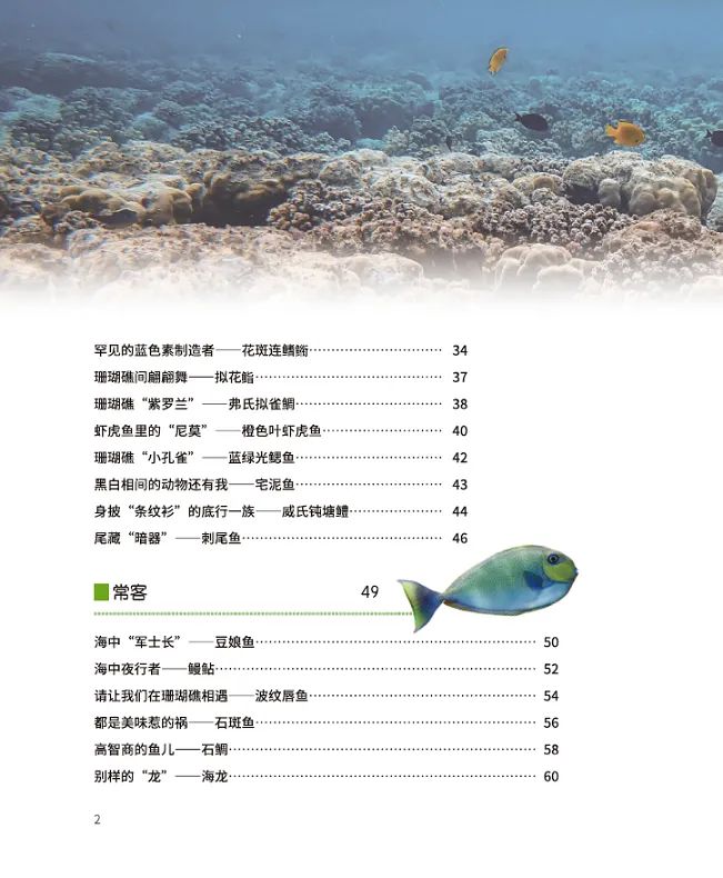 也许很多人对珊瑚礁生物的最初印象会源于礁石水族箱里色彩艳丽、相貌奇异的宠物鱼,对它们的生活习性却并不了解。《珊瑚礁里的鱼儿》书写了珊瑚礁里“原住民”“常客”“稀客”“不速之客”的生活。书中所述鱼类虽然只是珊瑚礁鱼类的一部分,但也从一个侧面展现了它们的灵动之美和生存智慧。有些鱼儿“鱼大十八变”,不仅变了相貌还会逆转性别,有些鱼儿则演化出非同一般的繁殖方式……