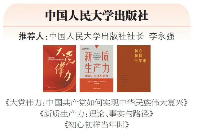 中国成人教育协会与中国大学出版社协会联合推出2025年全民终身学习活动社长总编荐书书目,这些推荐书目从国内72家优秀出版社报送的326种出版物中由国内知名专家进行了审读,最终入选110种出版物。中国人民大学出版社出版的《大党伟力:中国共产党如何实现中华民族伟大复兴》《新质生产力:理论、事实与路径》《初心初样当年时》3种图书入选。