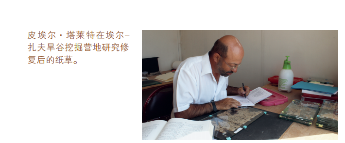 2013年在埃尔—扎夫旱谷的发现已经远远超出我们之前所有的设想。然而,保存和转移这些文献,确保它们的安全,使得我们当时根本没有时间思考它们的重要性。我们逐渐意识到,目前为止发现的所有纸草很可能最初是在胡夫统治末期被掩埋在这个洞坑内的。这个洞坑后来遭到扰动,纸草在古代就分裂成碎片了。我们采集到的这批纸草应该是在偶然的情况下,保存下来的非常连贯的档案材料。周密的挖掘使我们沉浸其中将近一个月的时间,这是一项意义非凡的考古事件,也是到目前为止我印象最深的一次经历。