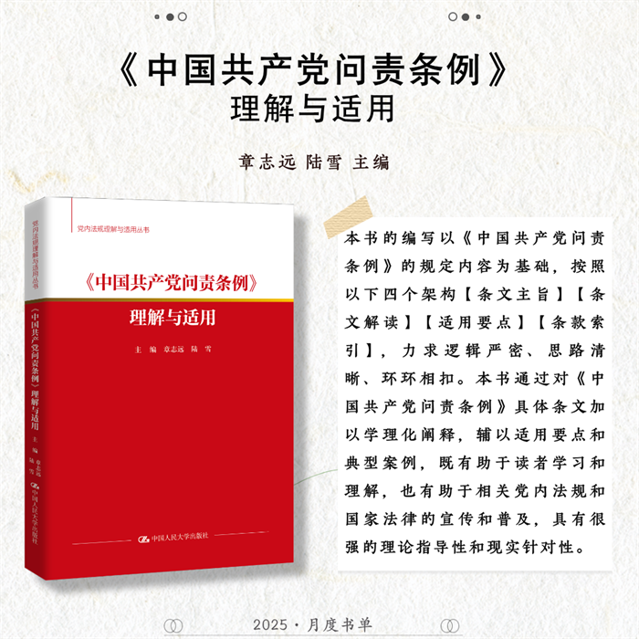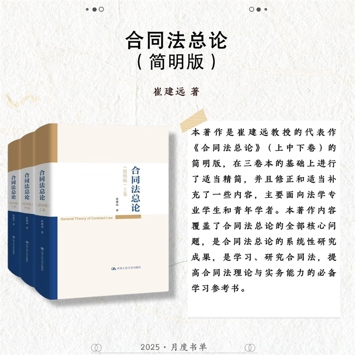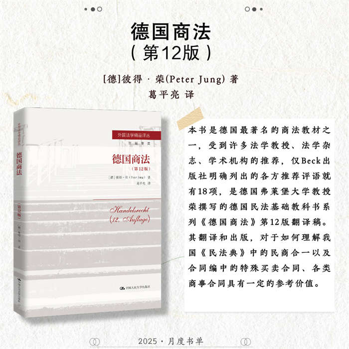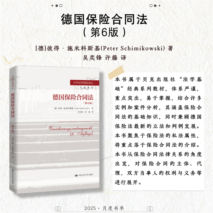 中国人民大学出版社推荐2025年7月法律、学术类新书,共6种图书,分别为:《〈中国共产党问责条例〉理解与适用》《合同法总论(简明版)》《德国商法(第12版)》《德国保险合同法(第6版)》《家庭教育服务:国际经验与中国实践》《赋能科研写作:DeepSeek & 智能体》。