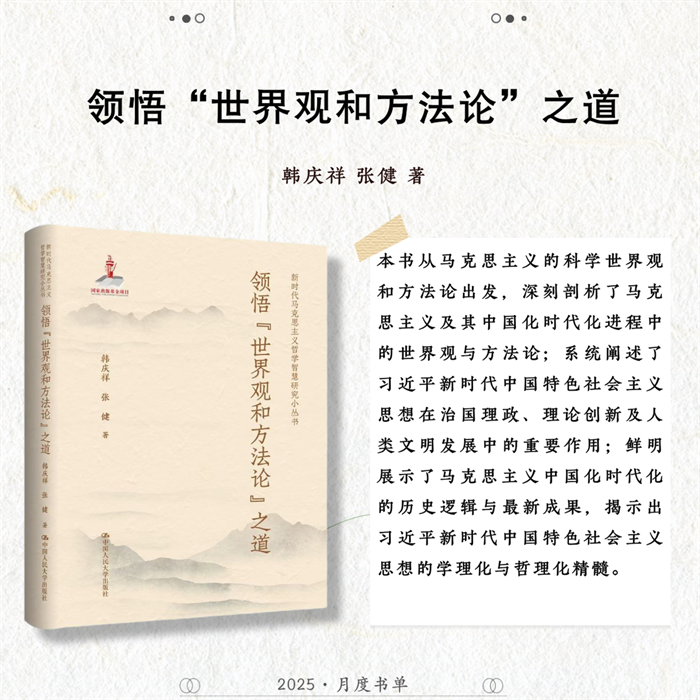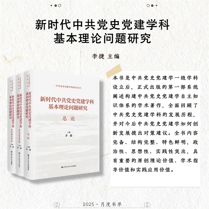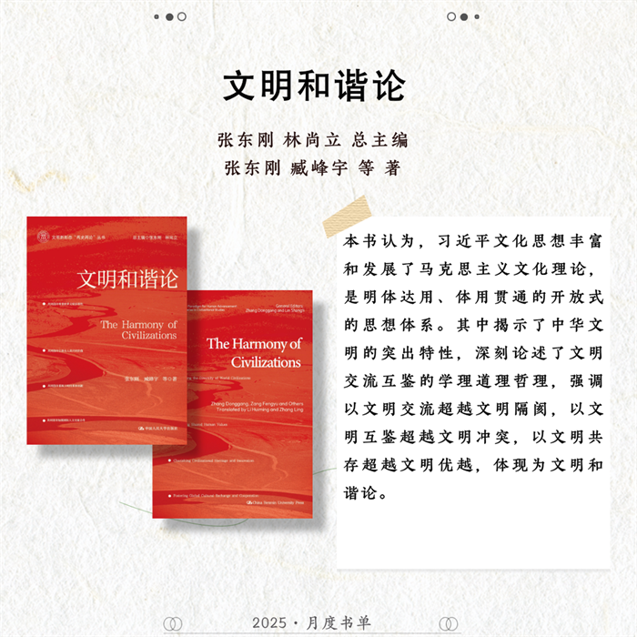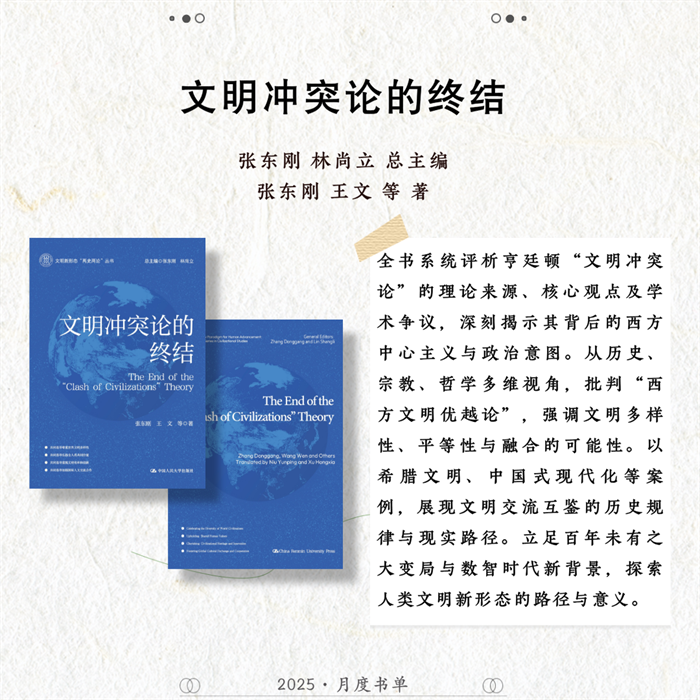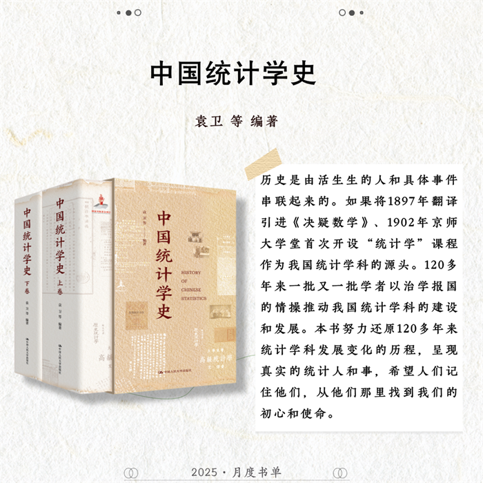 中国人民大学出版社推荐2025年7月主题出版新书,共5种图书,分别为:《文明和谐论》《文明冲突论的终结》《新时代中共党史党建学科基本理论问题研究》《领悟“世界观和方法论”之道》《中国统计学史》。