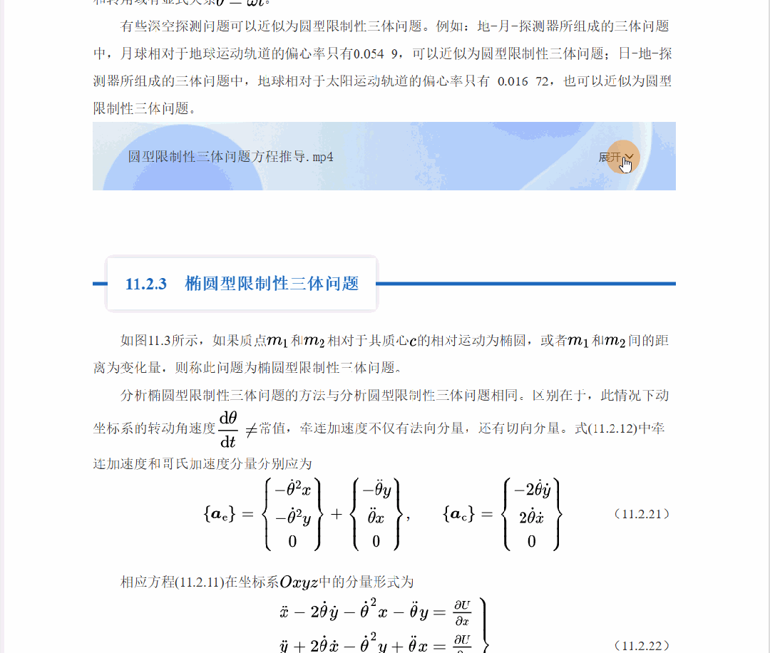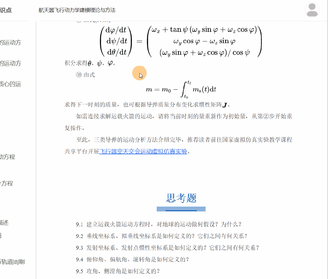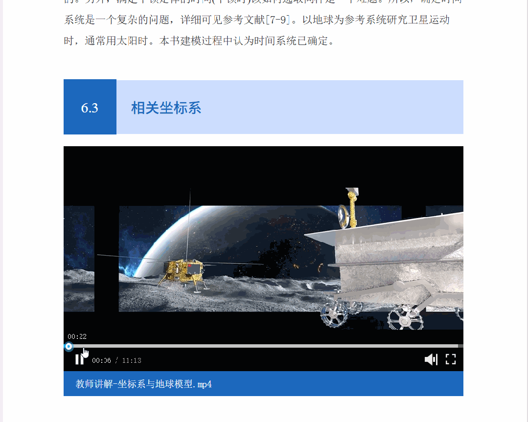 《航天器飞行动力学建模理论与方法》是国家级一流本科课程“飞行动力学基础”的配套数字教材,教材内容聚焦航天飞行动力学领域的基础理论和方法,依托现代信息技术,将航天器发展沿革、科技前沿,以及教学团队在航天动力学与控制领域长期积累的研究成果、教学设计、工程应用案例等内容进行数智化处理,在内容呈现上,教材整合了对应课程的慕课、智慧课程资源,综合运用了文字、图片、视频、动画以及思维导图等多媒体工具,让学习者能够依托丰富的教学资源系统地进行学习。