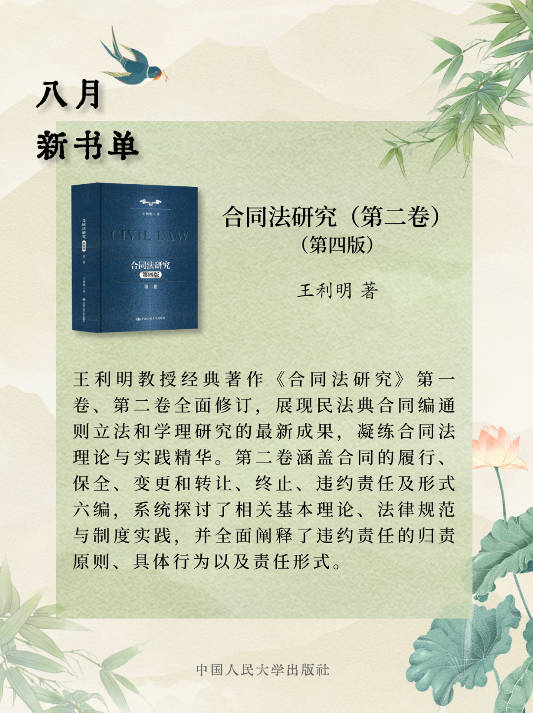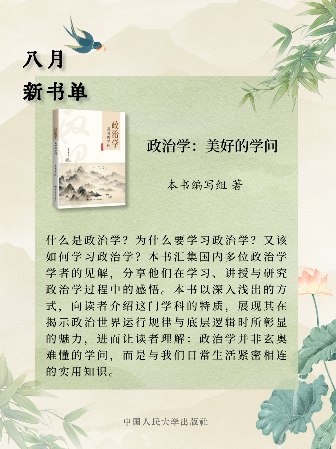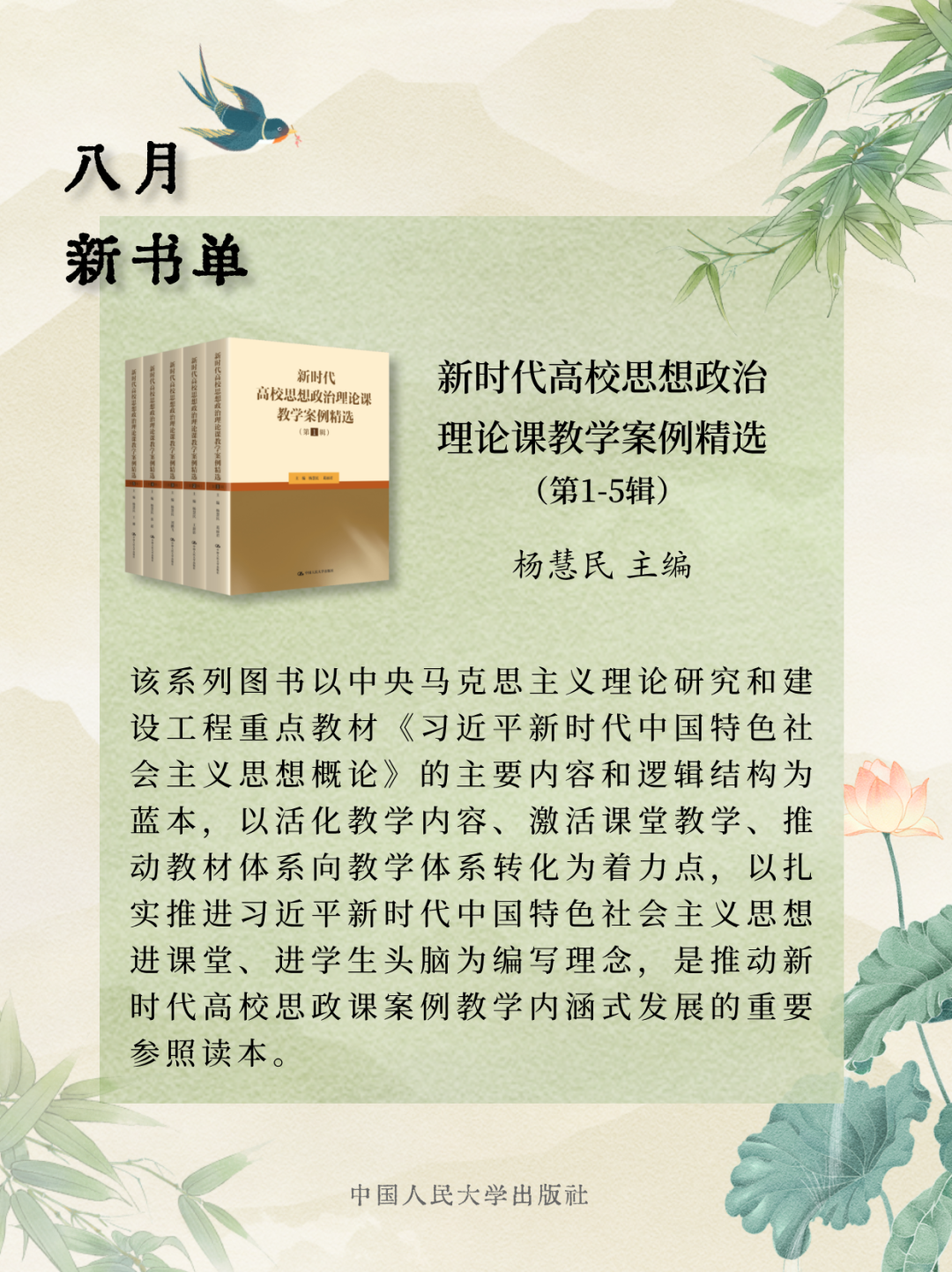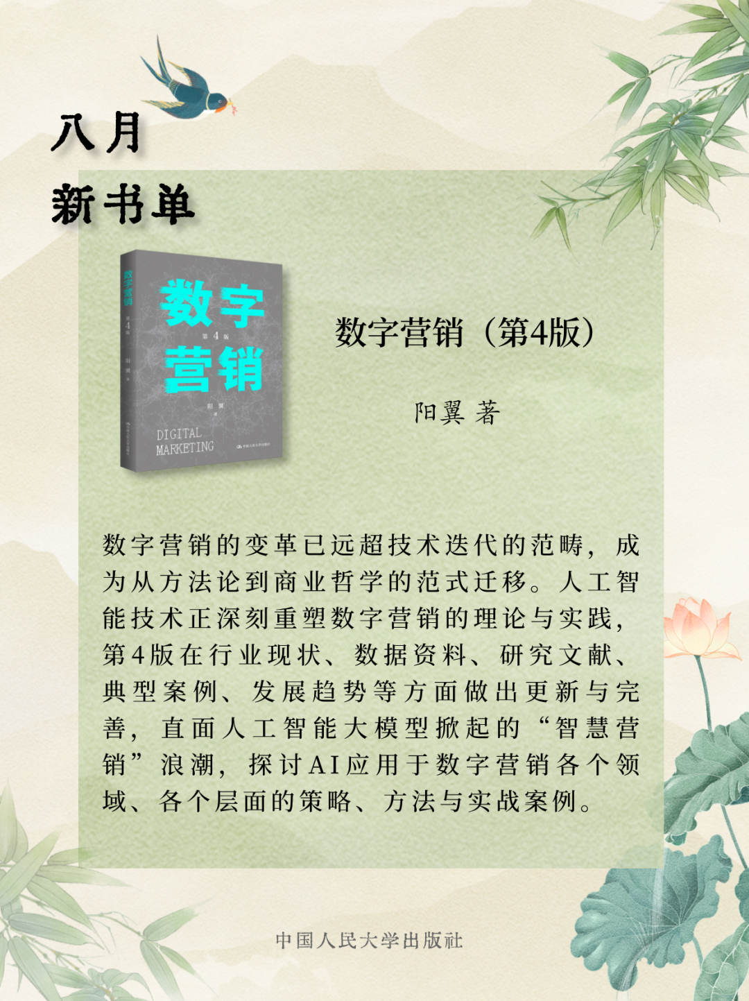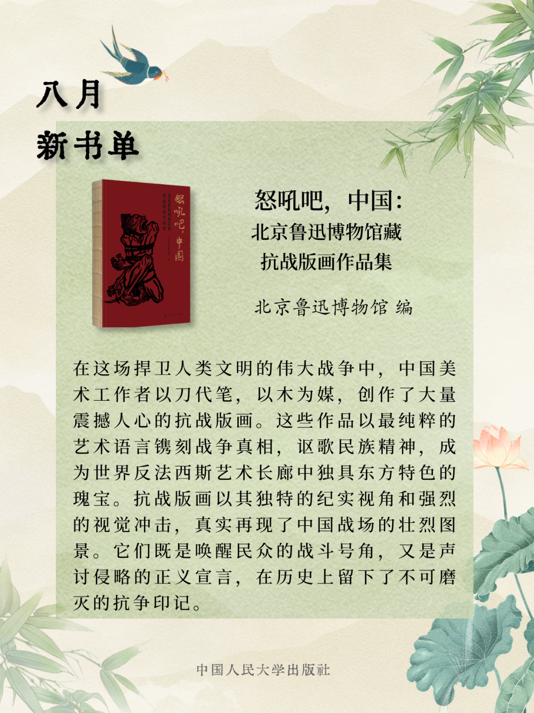 中国人民大学出版社推荐2025年8月新书单,共28种图书,分别为:《怒吼吧,中国:北京鲁迅博物馆藏抗战版画作品集》《坚持问题导向》《吾乡:中国易地扶贫搬迁纪实》《像马克思一样思考》《政治学:美好的学问》《新时代高校思想政治理论课教学案例精选(第1-5辑)》《数智教育学》《建构中国特色公共管理学:实践基础与学术前沿》《治愈世界:医学进步的黄金时代1840—1914》《AI风暴:中美博弈与全球新秩序》《组织战略、结构和过程》《数字营销(第4版)》《民事诉权基础理论研究》《民法典与民事诉讼法的交错》《数字经济法治保障研究:理论基础与法治实践》《合同法研究(第一卷)(第四版)》《合同法研究(第二卷)(第四版)》《如何理解政法:范畴、传统和原理》《行政法的技艺》《税制改革的法治逻辑》《小说家的致富经》《思想实验》《理性思辨:如何在非理性世界里做一个理性思考者》《未挂断的人生:心理援助热线的23次破晓对话》《心理咨询的个案概念化》《我比古人活得好:跨越时空的诊疗启示录》《成为儿童青少年心理治疗师》《不一样的单元教学设计统编高中语文(必修上册、下册)》。天气渐凉,愿这些书陪你告别盛夏,以沉静姿态,迎接秋日丰盈。