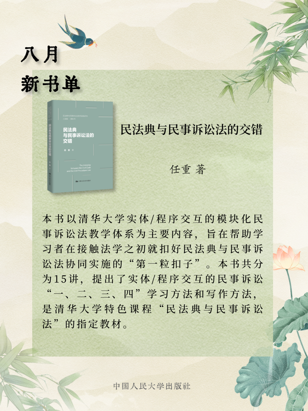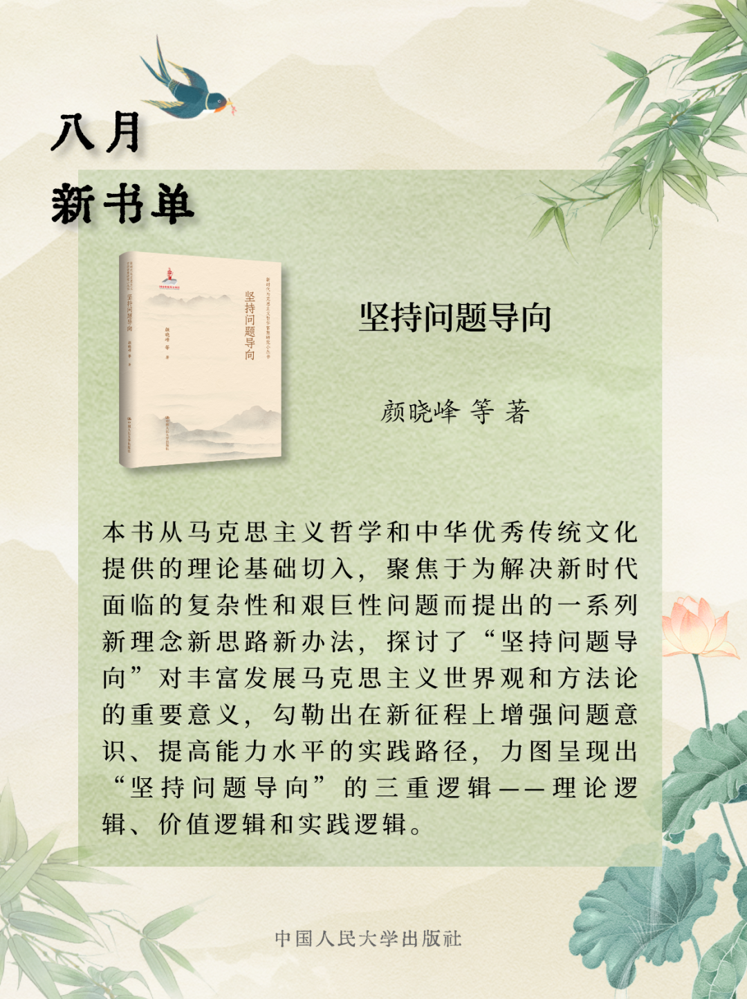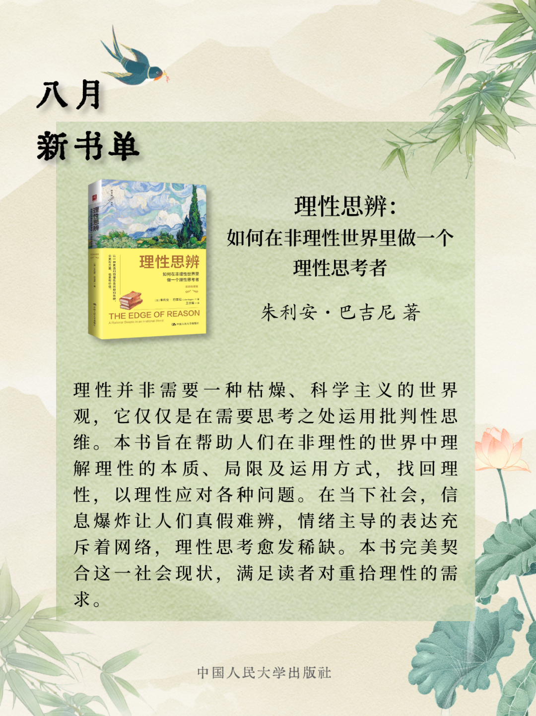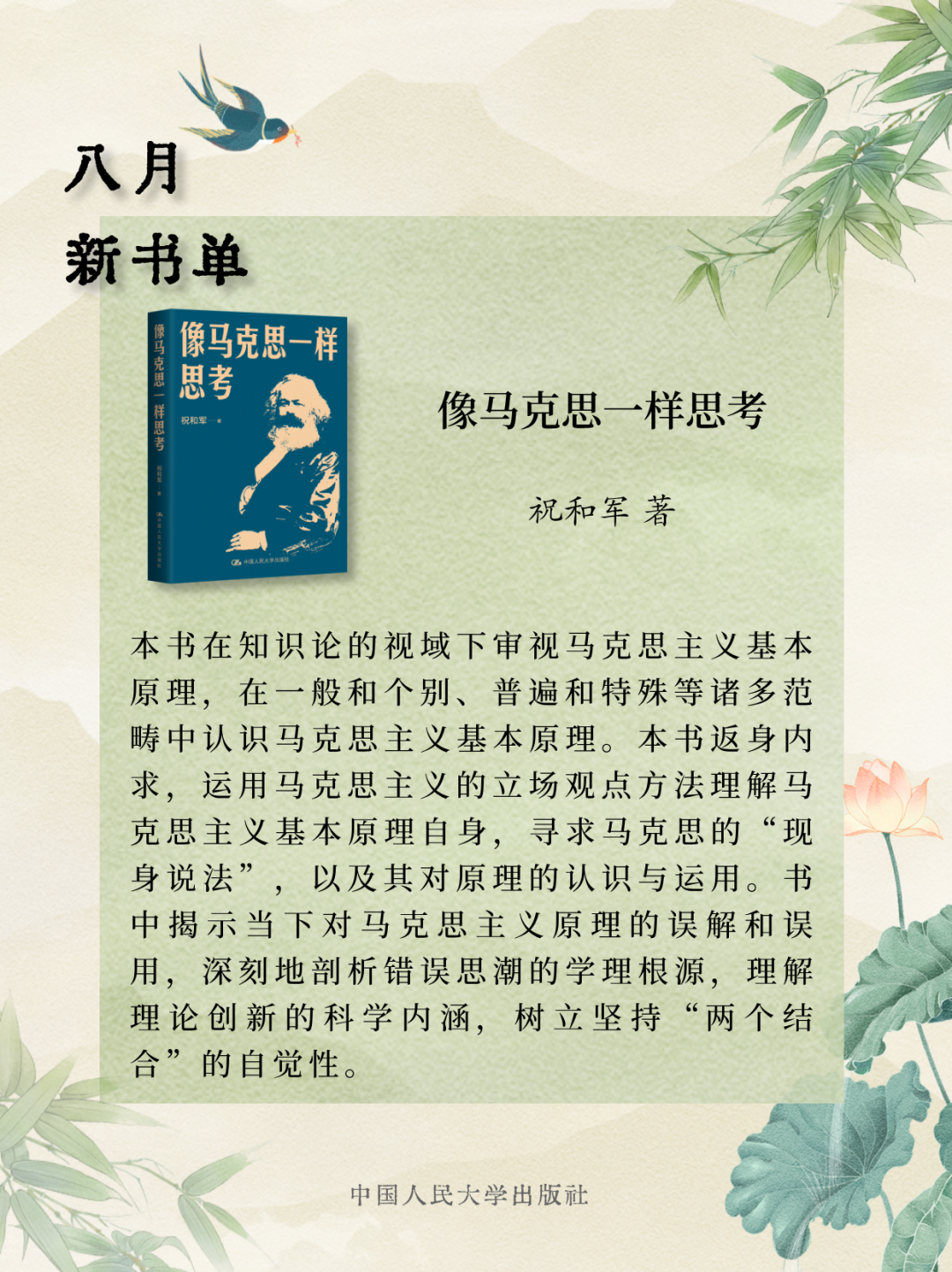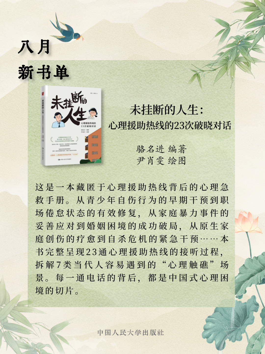 中国人民大学出版社推荐2025年8月新书单,共28种图书,分别为:《怒吼吧,中国:北京鲁迅博物馆藏抗战版画作品集》《坚持问题导向》《吾乡:中国易地扶贫搬迁纪实》《像马克思一样思考》《政治学:美好的学问》《新时代高校思想政治理论课教学案例精选(第1-5辑)》《数智教育学》《建构中国特色公共管理学:实践基础与学术前沿》《治愈世界:医学进步的黄金时代1840—1914》《AI风暴:中美博弈与全球新秩序》《组织战略、结构和过程》《数字营销(第4版)》《民事诉权基础理论研究》《民法典与民事诉讼法的交错》《数字经济法治保障研究:理论基础与法治实践》《合同法研究(第一卷)(第四版)》《合同法研究(第二卷)(第四版)》《如何理解政法:范畴、传统和原理》《行政法的技艺》《税制改革的法治逻辑》《小说家的致富经》《思想实验》《理性思辨:如何在非理性世界里做一个理性思考者》《未挂断的人生:心理援助热线的23次破晓对话》《心理咨询的个案概念化》《我比古人活得好:跨越时空的诊疗启示录》《成为儿童青少年心理治疗师》《不一样的单元教学设计统编高中语文(必修上册、下册)》。天气渐凉,愿这些书陪你告别盛夏,以沉静姿态,迎接秋日丰盈。