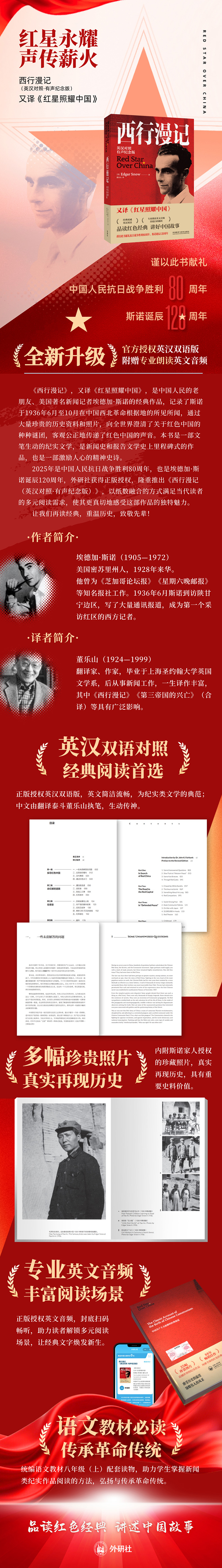 2025年是中国人民抗日战争胜利80周年,也是埃德加·斯诺诞辰120周年。值此特别时刻,外研社隆重推出《西行漫记(英汉对照·有声纪念版)》,以纸数融合的形式满足当代读者的多元阅读需求,使其更真切地感受这部作品的独特魅力。
