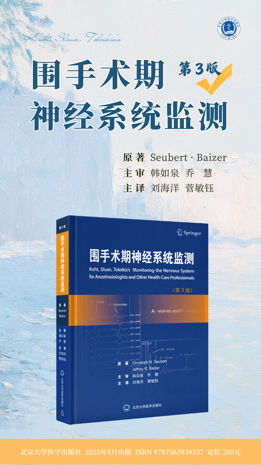 2023年原著第3版发行,在承袭前两版科学架构的基础上,创新构建“监测技术—临床应用—病例解析”三位一体的知识体系。尤其值得关注的是,新版新增清醒开颅与全身麻醉下脑功能区定位策略,多模态脑血流动力学监测技术创新,术中神经电生理信号解读范式,神经内镜颅底手术监测方案等前沿内容,系统性反映了该领域近10年来的重大理论突破与实践创新。从Antoun Koht教授、Tod B.Sloan教授、J.Richard Toleikis教授,再到现任主编Christoph N.Seubert教授和Jeffrey R.Balzer教授,历经三版的编者团队始终保持着国际顶尖水准,其多位成员更与我国麻醉学和神经监测领域保持着密切的学术互动。