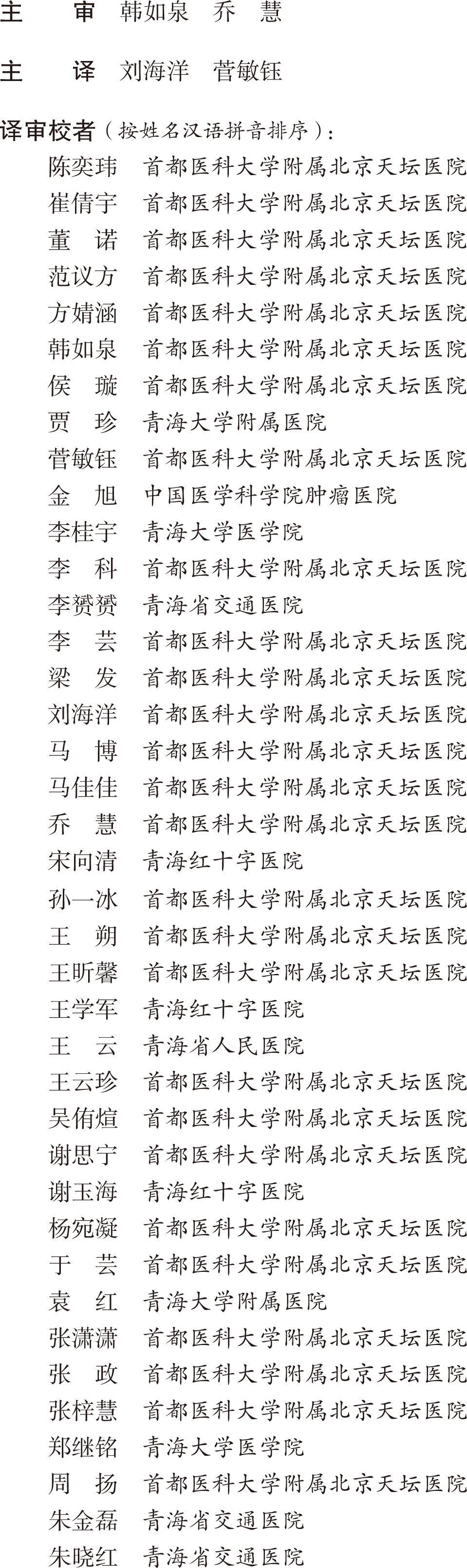 本次翻译工作主要由首都医科大学附属北京天坛医院承担,承蒙韩如泉教授和乔慧教授全程主审,在此谨致谢忱。为促进优质医疗资源区域均衡发展,我们特别邀请青海省医学同仁参与翻译工作。北京大学医学出版社袁帅军老师在出版统筹中展现出卓越的专业素养,全体译校成员勠力同心终成此作,在此一并致谢。