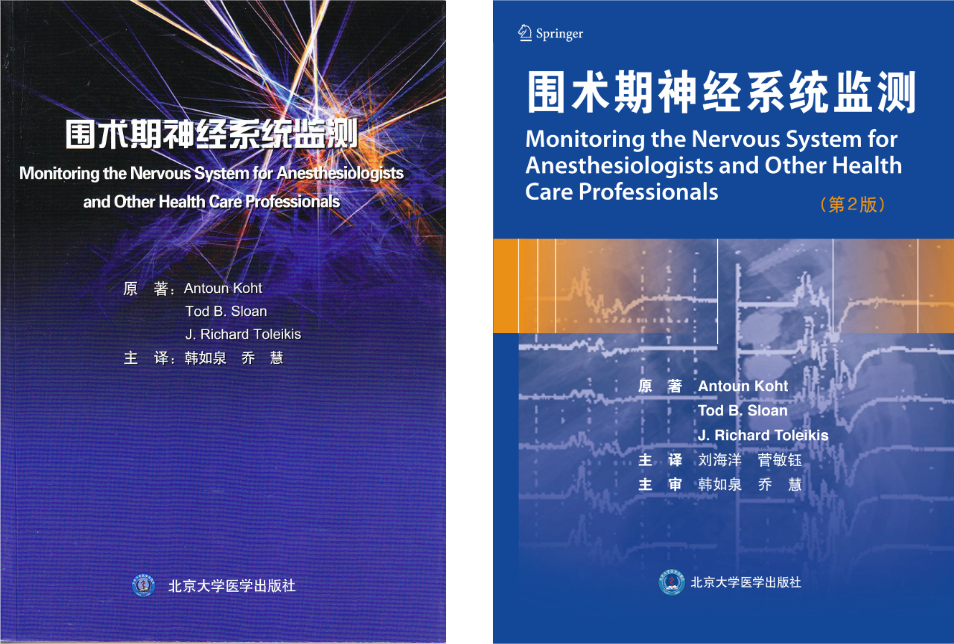 围手术期神经系统监测作为神经功能保护的核心技术,已逐渐成为保护神经功能完整性的标准策略。该技术通过实时评估神经功能状态,构建起指导手术决策、优化麻醉管理、降低围手术期致残率的科学路径,显著改善了患者的远期预后。我们团队分别于2013年和2018年有幸翻译了该领域经典著作Monitoring the Nervous System for Anesthesiologists and Other Health Care Professionals第1、2版,由北京大学医学出版社出版。得益于原著体系完整、临床导向的编写特色,中文版问世后深受麻醉学、神经外科及相关专业领域同仁好评。