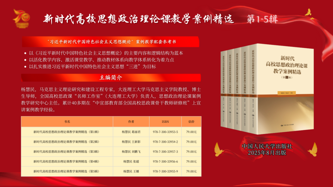 当“高大上”的理论遇上“接地气”的实践,当教材体系向教学体系高效转化,高校思政课的课堂会迸发怎样的活力?由马克思主义理论研究和建设工程专家、大连理工大学杨慧民教授领衔主编,中国人民大学出版社出版的《新时代高校思想政治理论课教学案例精选(第1-5辑)》正式首发,为全国思政课教师带来了一份“教学宝藏”!