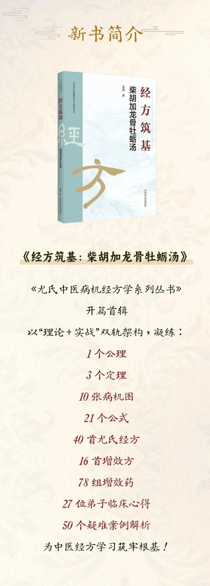 《经方筑基:柴胡加龙骨牡蛎汤》作为系列丛书的第一本,首次构建以“病便词”为核心的“尤氏中医病机经方三步法处方流程”与“主方+增效方+增效药”的开方公式。这一创新理论,另辟蹊径,让经方的应用不再停留于表面症状的对应,而是深入疾病病机发生发展的本质,为临床医生提供了更精准、更科学的用药依据,实现了经方理论从经验总结向科学阐释的跨越。