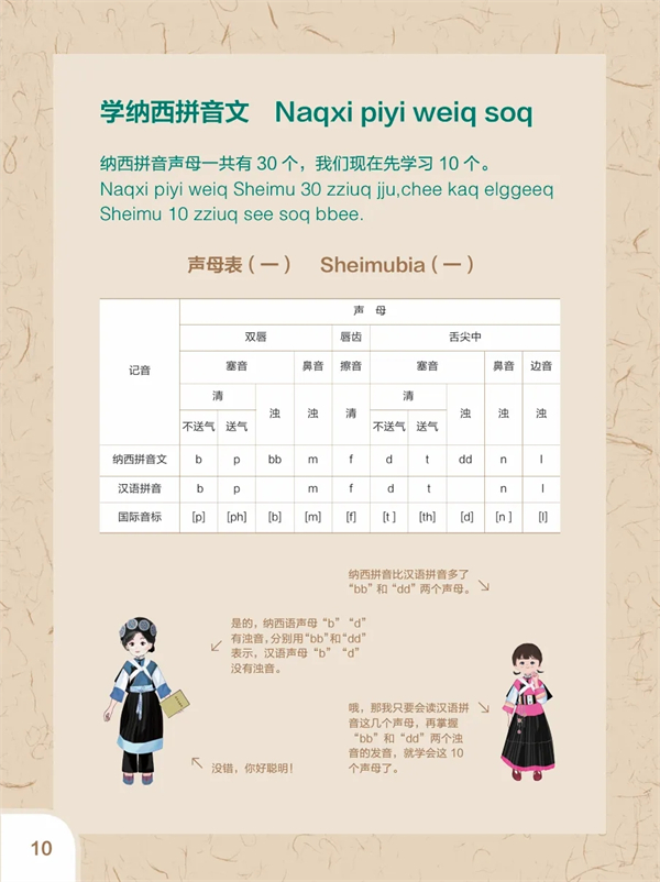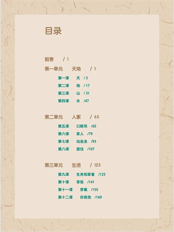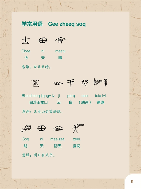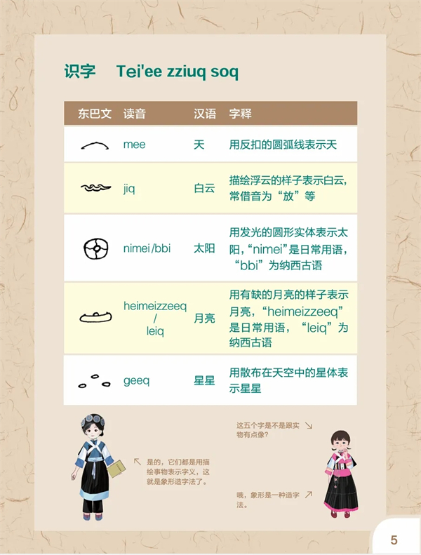 该书精选约200个基础常用东巴象形文字,按照“天地”“人家”“生活”三大主题进行单元划分,共计12课。每课将东巴象形文字、汉语、纳西拼音三者对照,通过识字、单句、纳西拼音、词语拼读、书写、知识拓展等模块,带领读者理解每个东巴象形文字的构成、读音、书写规范及应用场景。基于语言学理论,内容的编写从单字到文化内涵逐层深化,同时引入“文字结构拆解”“纳西拼音对照”等原创教学方法,降低学习门槛,提高吸引力。