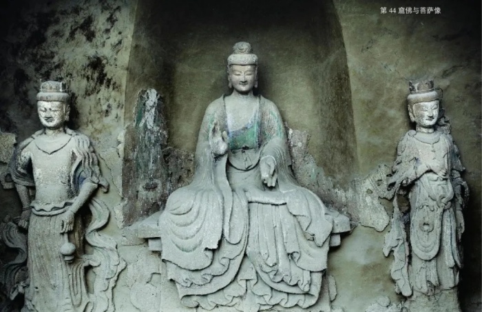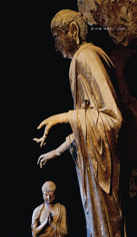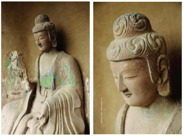 “东方美人”坐在第44窟正壁前。她头束水涡纹高肉髻,面如满月,鼻梁挺直,嘴角那抹浅笑像刚融化的春水,端庄里透着母性的娴静。这尊西魏造像被认为是以乙弗皇后为原型。书中说她“衣纹如水波垂落,似莲花绽放”,泥塑厚重却线条流畅,仿佛能看到她轻轻呼吸的弧度。站在她面前,会懂得什么叫慈悲:不是高高在上的威严,而是看透人间悲欢后,依然愿意温柔注视的目光。这抹微笑穿越了千年,成了麦积山最动人的名片。