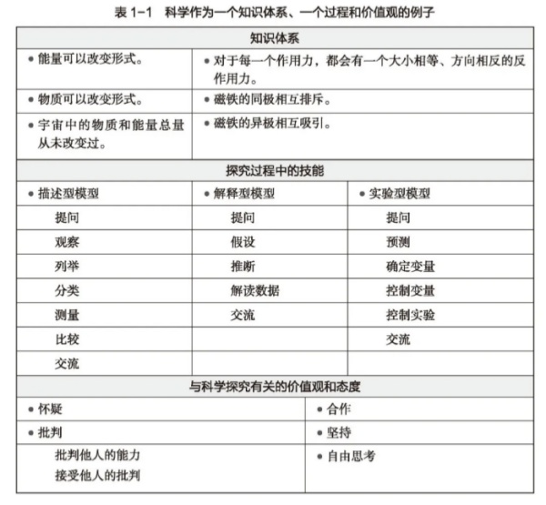 作为科学教师,你所要做的,就是教授与寻求科学解释有关的实践、价值观和态度,以及支持当前对自然现象的科学解释的核心概念和原则(见表1-1)。