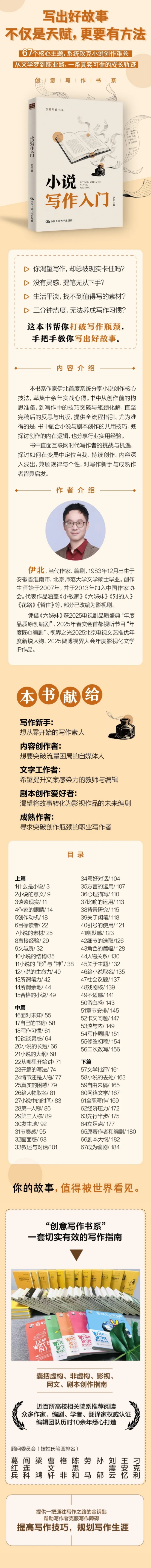 在人人皆可发声的互联网时代,写作的价值与方向该如何坚守?作家伊北沉淀十余年创作经验,首次系统分享小说创作全链路心得。从灵感捕捉到故事成型,从技巧打磨到突破瓶颈,再到作品的最终呈现与出版。这本书不仅是技术指南,更是一位同行者的真诚对话。