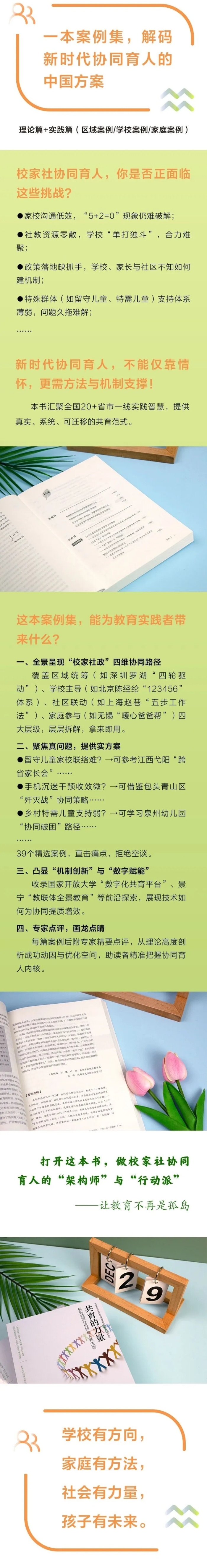 教育是培养人的事业,是一项庞大且复杂的系统工程,离不开学校、家庭、社会的密切配合与协同发力。希望这本案例集能够成为连接各方的桥梁,能够吸引更多人投身育人事业,汇聚社会资源,凝聚多方合力,推动校家社协同育人机制不断完善,共同营造全社会关心支持教育、合力培养时代新人的良好氛围。衷心期待每一个孩子都能在校家社协同育人的优质环境中茁壮成长,衷心期待每一个孩子都能拥有一个成功幸福的美好未来。