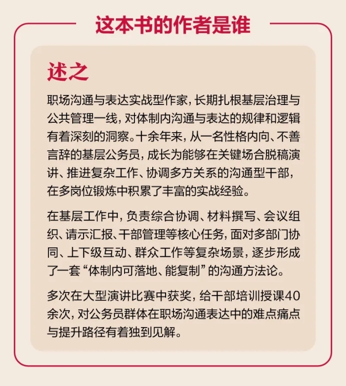 虽然我写的是文学,而述之写的是职场沟通,但这本书让我看到另一种“现实写作”的力量。它不是技巧堆砌,而是来自一线工作的冷静观察——一句请示、一场汇报、一次协调,都被他写得鲜活而有温度。语言在他笔下,是行动的力量。