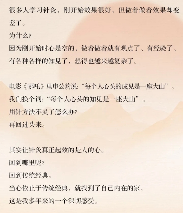 除了穴位、经络、针具、方法等有形之“物”,不可或缺的是每个人本自具足的“神明”“太极”“感通”等内在力量,《黄帝内经》所谓:“是故刺法有全神养真之旨,亦法有修真之道,非治疾也。故要修养和神也。”