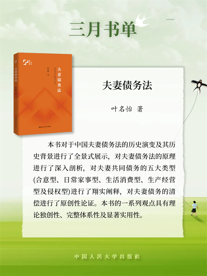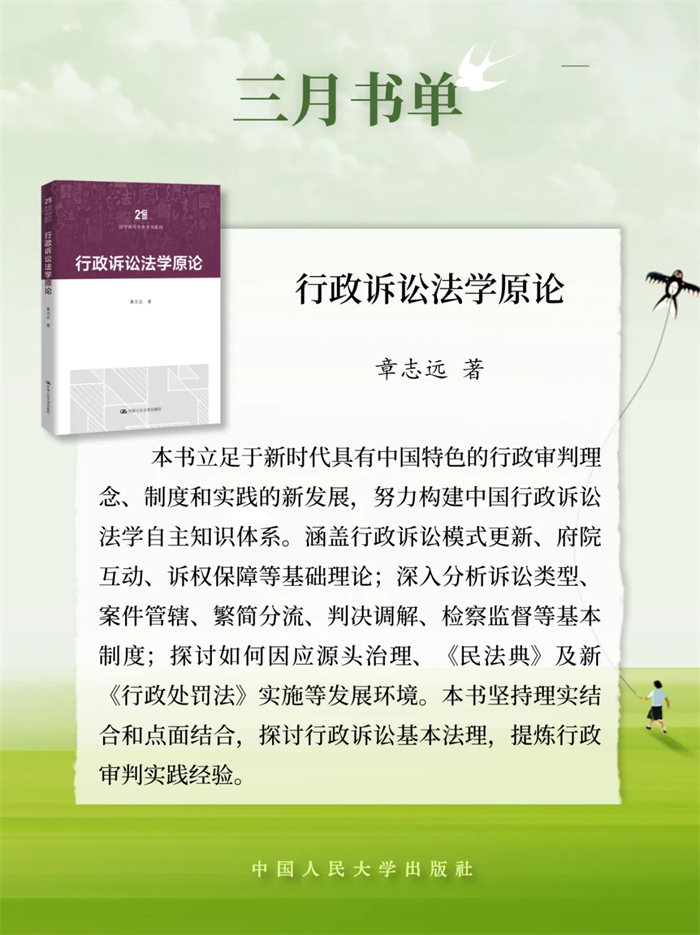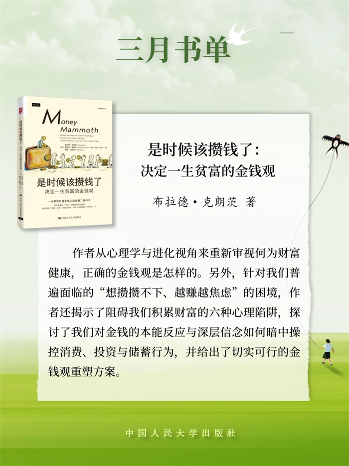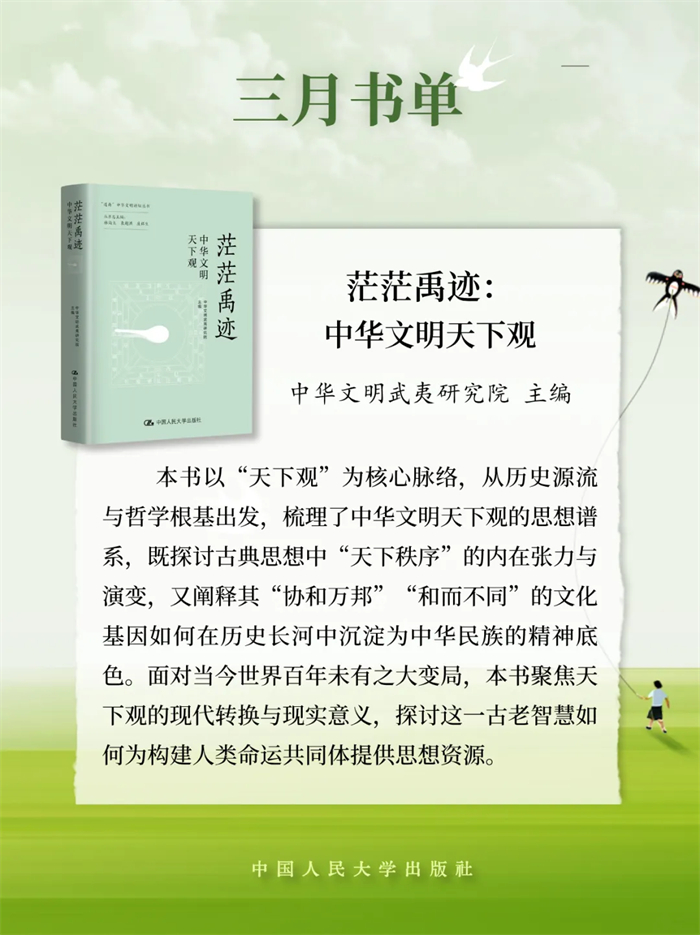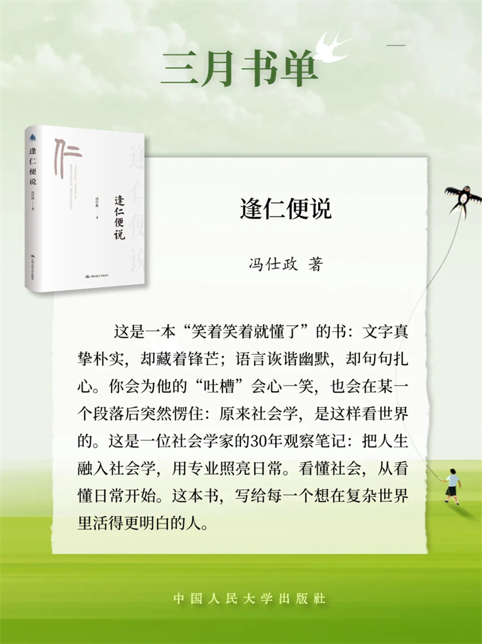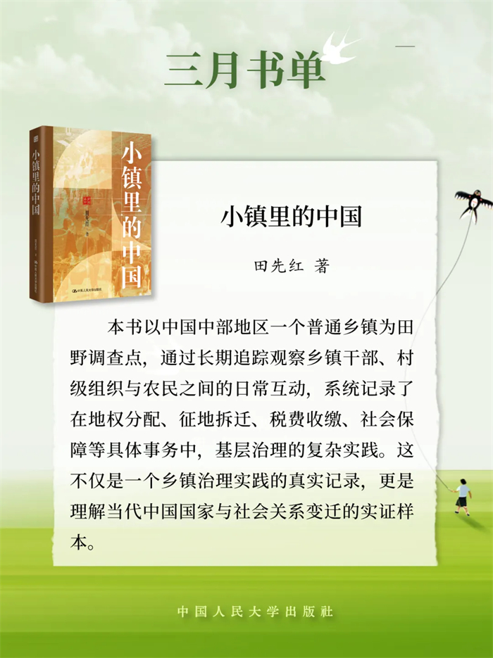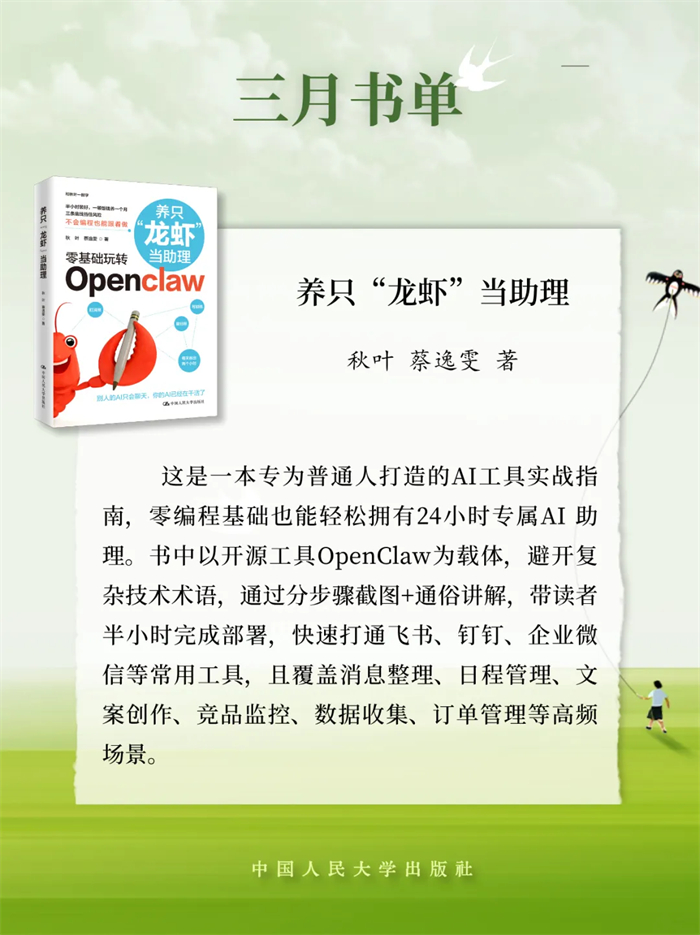 中国人民大学出版推荐2026年3月新书单,本书单包含21种图书,分别是:《逢仁便说》《为什么不要社会主义?》《茫茫禹迹:中华文明天下观》《小镇里的中国》《县乡生活:一场生活方式的巨变》《茶行天下:世界共享的茶艺文化》《意识简史》《马克思主义法学中国化时代化专题研究》《夫妻债务法》《行政诉讼法学原论》《罗马法精神·第一册(第五版)》《股东会决议程序研究》《养只“龙虾”当助理》《OpenClaw实战应用:安全养“龙虾”手册》《价值投资新手入门》《时间革命:打破员工过度工作与时间浪费的管理困局》《战争与人性》《是时候该攒钱了:决定一生贫富的金钱观》《友情心理学:如何在关系中彼此疗愈》《疗心法门:源于中国传统文化的心理疗法》《治愈情感忽视:创伤儿童的心理治疗》。
