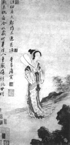 唐寅这幅画的构思显然受到汉代班婕妤之事的影响,班婕妤是汉代的一位美貌女子,极有文才,为汉成帝所宠幸。后来,宫中来了赵飞燕,汉成帝为这位身材姣好的绝代佳人所迷恋,于是,班婕妤便遭冷落。多才的班婕妤作了一首《怨诗》,诗云:“新制齐纨素,鲜洁如霜雪。裁为合欢扇,团团似明月。出入君怀袖,动摇微风发。常恐秋节至,凉飙夺炎热。弃捐箧笥中,恩情中道绝。”后人又称此为《团扇诗》,诗中借一把扇子的行藏,看人世的炎凉。诗中道尽了恩情中道绝给这位女子带来的悲伤体验。唐寅曾有《班姬团扇图》传世,这幅《秋风纨扇图》,是对这一主题的深化。