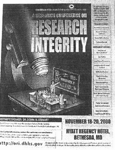 一台巨大的显微镜;在载物台上的不是普通的生物切片,而是一群进行研究工作的科学家。这是2000年11月贝塞斯达大会宣传画的内容。那次大会的主题是“探讨研究的诚信”。这幅宣传画作为插图,出现在《科学家的不端行为——捏造·篡改·剽窃》一书中。