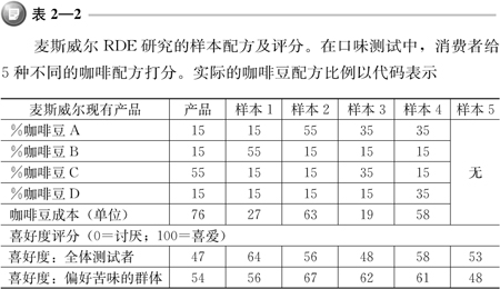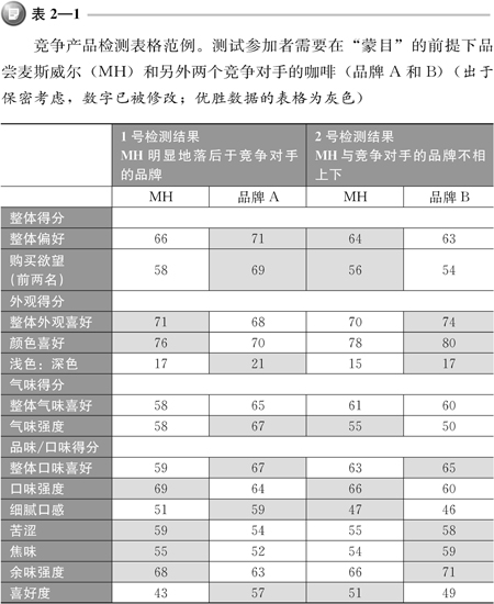 麦斯威尔在一次定期地测试产品的过程中发现了问题。在让接受调查的消费者选择他们喜欢的咖啡时,很多人并没有选择麦斯威尔的产品(在所谓“双盲口味测试”中,咖啡品牌会被隐藏起来)。表2—1为双盲测试结果的范例。