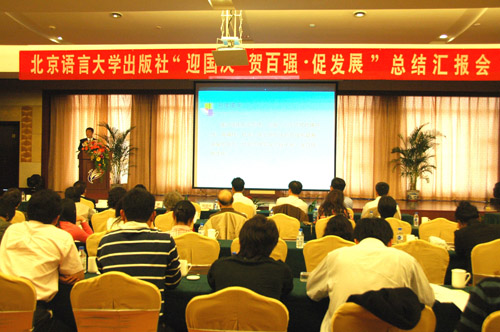 为迎接祖国60年华诞,庆祝我社入选“全国百佳图书出版单位”,9月27日,“我与祖国共辉煌——北语社迎国庆贺百强促发展总结汇报会”在北京顺义瑞麟湾会议中心隆重举行。霍明杰副校长出席会议,我社全体在职及退休员工参加了会议。