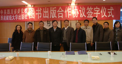 2009年11月24日下午,西南财经大学出版社与中共四川省委党校图书合作协议签字仪式在出版社隆重举行。西南财经大学副校长曾道荣教授、中共四川省委党校副校长周治滨教授、中共四川省委党校科研处处长李翔教授、西南财经大学出版社社长冯建教授等相关负责人出席了签字仪式。签字仪式由出版社冯建社长主持。