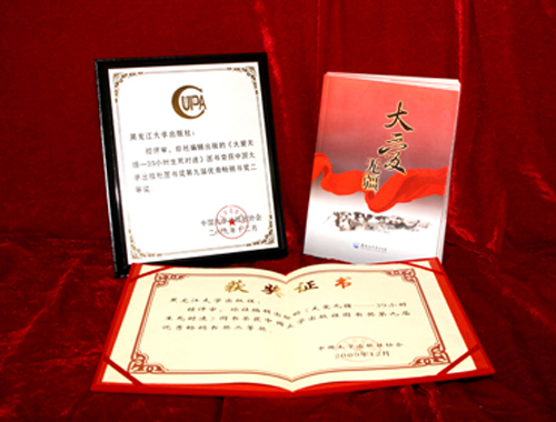 近日,第九届“中国大学出版社图书奖优秀畅销书奖”评选结果揭晓,黑龙江大学出版社出版的《大爱无疆——39小时生死时速》荣获二等奖。 2008年3月,黑龙江大学出版社以出版人特有的敏感性和使命感,把发生在3月8日龙江人民跨省营救吉林产妇小娇的故事以图书的形式展现给读者,这就是体现黑龙江人热情、友爱、无私、奉献精神的《大爱无疆——39小时生死时速》。 这部书全景式再现了一次由自发到自觉的跨省大援救的爱心大奉献行动,彰显了无私真情、人间大爱,是弘扬主旋律、歌颂无疆大爱、铸就时代精神的时效性作品,对于深刻展示黑龙江文化优秀的历史积淀,倡导和激发龙江精神具有重要的意义。 本书将一场人间大爱救助行动中的深挚强烈的情感定格,亲证了龙江民众的可亲、善良、真诚、大爱和崇高,歌颂的是一曲由万千民众谱写的生命礼赞,唤醒了人们内心深处潜藏的温暖和良善,所以此书2008年4月一经出版,就得到了黑龙江、吉林等地读者的广泛关注。与此同时,我社把与黑龙江电台联合在中央大街举办的《大爱无疆》图书的义卖专款全部捐赠给了“龙广爱心基金”。 来源:黑龙江大学出版社2010-10-29