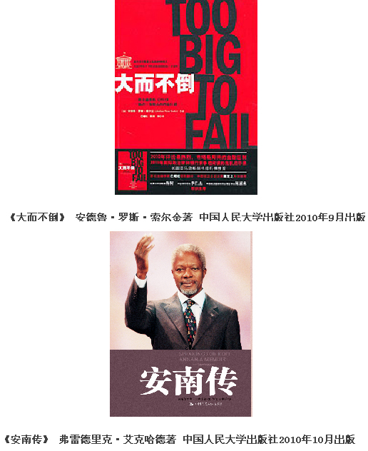 1月4日出版的《光明日报》发布了2011年首期“光明书榜”,由中国人民大学出版社出版的《大而不倒》、《安南传》榜上有名。 《大而不倒》通过一幕幕生动的场景描述,向读者客观而详尽地展现了金融危机发生之后美国主要监管机构和投行的众生相。前所未有的访谈,不曾公开的华尔街决策内幕,揭示了美国经济萧条如何发展成全球金融危机,再现了从银行到政府再到整个美国身处金融危机第一现场的反应。 《安南传》是联合国前发言人撰写的关于联合国前秘书长科菲•安南的个人传记,全书真实、客观地记录了安南的成长经历、婚姻和家庭生活、长达四十多年的联合国生涯及担任联合国秘书长的十年,细腻地描写了安南的个性特征,首次披露了他鲜为人知的内心世界。 2011年《光明日报》“光明书榜”版在原“读书”版的“光明荐书榜”和“荐书榜特别延伸”两个栏目的基础上扩充而成,以双周刊的形式定期推出,为广大读者选书、读书提供一份有价值的参考。 来源:中国人民大学出版社2011年01月05日