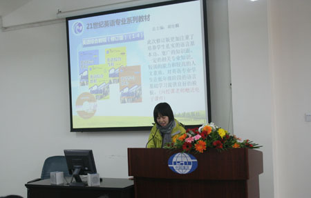 远道而来的北京大学出版社主任张冰教授也作了精彩的发言。张教授特别介绍了由胡壮麟教授主编的这套系列教材,并高度评价了《英语综合高级教程》。朱丽娜编辑向各位与会代表详细展示了北京大学出版社英语专业系列各教材的特色。