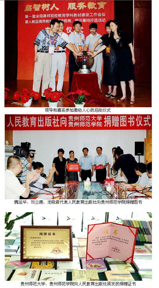 8月8日,由人民教育出版社和中国教育学会教育学分会联合主办的“第一届全国高师院校教育学科教材建设工作会议暨人教版高师教材优秀经销商、展示基地评选活动启动仪式”在贵州省贵阳市召开。来自全国知名师范院校的专家、教授和全国高师教材发行渠道相关负责同志共60余人出席。 人教社副总编辑魏运华致开幕词,文化教育编辑室主任刘立德宣读了中国教育学会教育学分会理事长吕达给大会的贺信。贵州出版集团党委副书记、总经理彭晓勇在致辞中对人教社举办全国高师院校教育学科教材建设工作会议表示嘉许,希望以后能够加强合作,实现共赢。人教教材中心副总经理龙晓君介绍了人教版高师教材的整体营销战略和“以服务教学为核心”的市场推广策略及相关措施,总结了人教社高师教材和教育图书的渠道建设情况,并详细解读了人教版高师教材优秀经销商、展示基地评选活动的实施方案,希望并期待全国重服务、讲信用、懂市场、愿意为人教版高师教材做大做强的发行企业,通过评选活动成为我们的优秀经销商。 评选活动启动仪式把会议推向高潮,魏运华、刘立德、龙晓君和贵州出版集团总经理彭晓勇、贵州师范大学教授余小茅、贵州新华书店集团公司副总经理施慧作为高师教材产、学、研、编、印、发的代表,共同把手放在象征合作共赢的启动仪式球上,伴随着阵阵热烈的掌声和欢呼声,“人教版高师教材优秀经销商、展示基地评选活动启动仪式”红色激光字迹在启动球内旋转闪出。 会议研讨期间,院校代表和营销代表分别就高师教材的编写与研发问题、发行与营销问题等进行了研讨。院校的代表就人教版高师教材的编写和使用中遇到的问题,积极献言献策。江苏南通大学教育科学院院长丁锦宏在发言中说我们很看重并认同人教社的品牌,人民教育出版社出版的高师教材质量高,希望人教社能够加强个性化需求教材的开发。贵州师范大学教授余小茅表示今后要更多地选用人教版教材,采用人教版教材的配套产品,提高教学质量。经销商代表讨论气氛十分热烈,对评选方案积极发言,部分经销商提议人教社要更多的到院校去做宣传和沟通工作,把优秀教材更多地推广到使用者──师生手中。 会议期间,为更好地支持西部师范院校的教育建设,人民教育出版社分别向贵州师范大学和贵州师范学院各捐赠1000册各类高师教材图书,并在贵州师大举行了捐赠仪式。贵州师范大学副校长李存雄、贵州师范学院副院长石培新出席捐赠仪式并致谢词,同时代表校方向人教社颁发捐赠证书。 来源:人民教育出版社