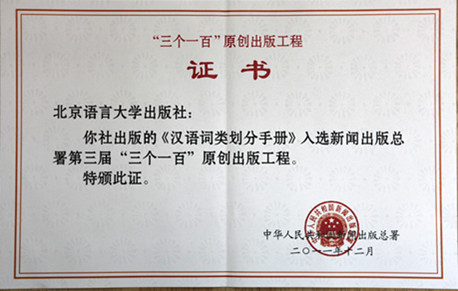 2011年12月27日,国家新闻出版总署公布了第三届“三个一百”原创图书出版工程图书入选书目。北京语言大学出版社出版的《汉语词类划分手册》成功入选第三届“三个一百”原创图书出版工程人文社科类。新闻出版总署副署长邬书林及各司主要领导出席会议并为获奖者颁奖。北京语言大学出版社副社长兼副总编辑张健和对外汉语教育事业部副主任、入选图书责编王亚莉代表北京语言大学出版社领奖。 “三个一百” 原创出版工程,是新闻出版总署贯彻落实科学发展观,推动社会主义文化建设,促进文化大发展大繁荣的重要举措,是出版界、学术界共同参与、合力推动的一项文化创新工程。自2006年启动以来,至今已成功举办3届,成为总署推动文化创新的一项重要出版工程,产生了良好的社会反响,有力推动了原创图书出版工作。第三届“三个一百”原创图书出版工程评选图书为2008年1月至2010年12月出版的百万余种新版图书,全国426家出版社共计报送了参评图书1167种,最终298种图书成功入选,其中人文社科类98种,文艺少儿类100种,科学技术类100种。 《汉语词类划分手册》是北京语言大学出版社2009年出版的学术研究著作,由当代著名青年语言学家袁毓林教授编写。该著作构架新颖,既有词类理论分析和测试量表,又有900多个词的实例分析和丰富的引用文献,为语法学习和词类教学工作提供了很好的参考。另外,该著作还实现了网络版汉语词类测试,用户进入http://ccl.pku.edu.cn:8080/pos/firstpage.htm网站后,可输入被测词,自动获得词类归属及其隶属度。 来源:北京语言大学出版社2012年1月10日