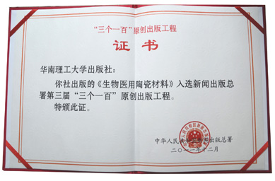 华南理工大学出版社出版的《生物医用陶瓷材料》入选新闻出版总署第三届“三个一百”原创图书出版工程,是广东省唯一获此殊荣的科学技术著作。