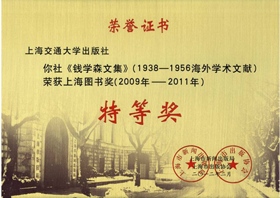 2月23日,在上海市新闻出版(版权)工作会议上,第十二届上海图书奖评比结果揭晓,上海交通大学出版社喜获五项上海图书奖,其中,《钱学森文集(1938-1956海外学术文献)》荣获特等奖。上海交大出版社社长韩建民上台接受了上海市委常委、副市长屠光绍和上海市委常委、宣传部部长杨振武的颁奖。 来自上海33家出版社的100种图书在此次评选中赢得殊荣。其中,特等奖3个,分别由上海交通大学出版社的《钱学森文集(1938-1956海外学术文献)英文版、中文版》和上海人民出版社的《中国共产党90年图集》、上海古籍出版社的《清代诗文集汇编》获得。