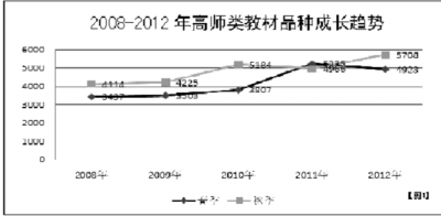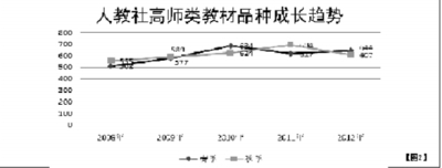 作为教材品种强社的人民教育出版社,在高等师范类教材上一直处于优势地位,从2008年到2012年五年中,人教社高师类教材品种比重领先于其他各家出版社,仅落后于高教社位列次席,优势也愈发明显。从五年来可供品种规模成长情况上来看,人教社高师类教材可供品种总体发展平稳,并呈稳步增长趋势,春秋两季总体涨幅分别为26.77%和9.37%。(见图2)
