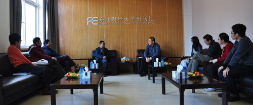 2012年12月24日,大连市现代服务职业教育集团秘书长、大连职工大学暨大连商业学校副校长邓国民,大连商业学校中职部教务处处长李文东等3人莅临东北财经大学出版社就职业教材出版事宜与东北财经大学出版社进行了洽谈。东北财经大学出版社副社长宋玉平、职业教育编辑部主任张旭凤以及职业教育编辑部编辑周欢、杨慧敏、郭海雷、曲以欢参加了此次洽谈。