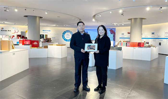 雅昌文化集团综合营销中心总经理金燕向大学版协秘书长代根兴赠送参观合影