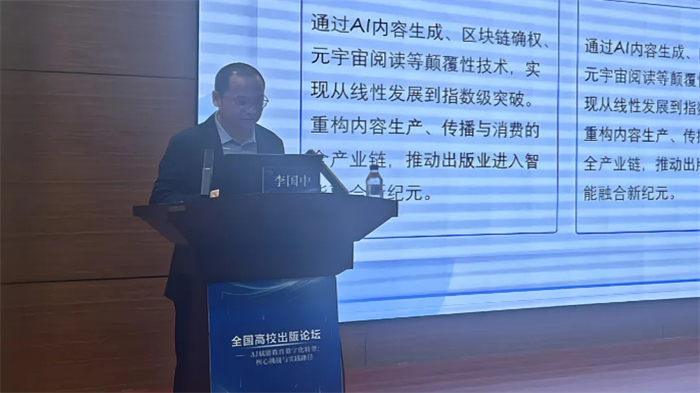 冯正玉:在“全国高校出版论坛”探讨“AI赋能教育数字化转型”,回应了时代命题,高校出版在教育数字化转型中承担着关键使命。AI赋能教育是数字时代教育变革的核心驱动力,具有三个维度的时代意义:第一,重构知识传播的底层逻辑;第二,破解教育公平的深层矛盾;第三,引领人类文明的范式革新。在此提出转型倡议:做“有温度的技术赋能者”;做“开放生态的建设者”;做“未来教育的领跑者”。希望以此次论坛为契机,以技术赋能教育质量提升,助力建设教育强国。