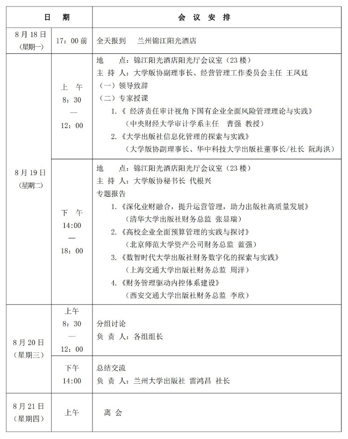 2025年全国大学出版社财务管理工作培训研讨会日程表