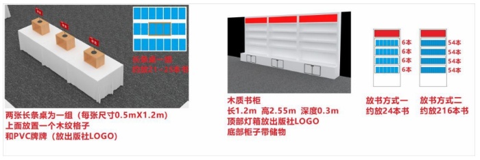 根据装修公司提供的展位设计方案,每个参展出版社可拥有两张长条桌、一个书架。以25x15cm的图书为例进行测算,可摆放图书50—250册(见下图)。
